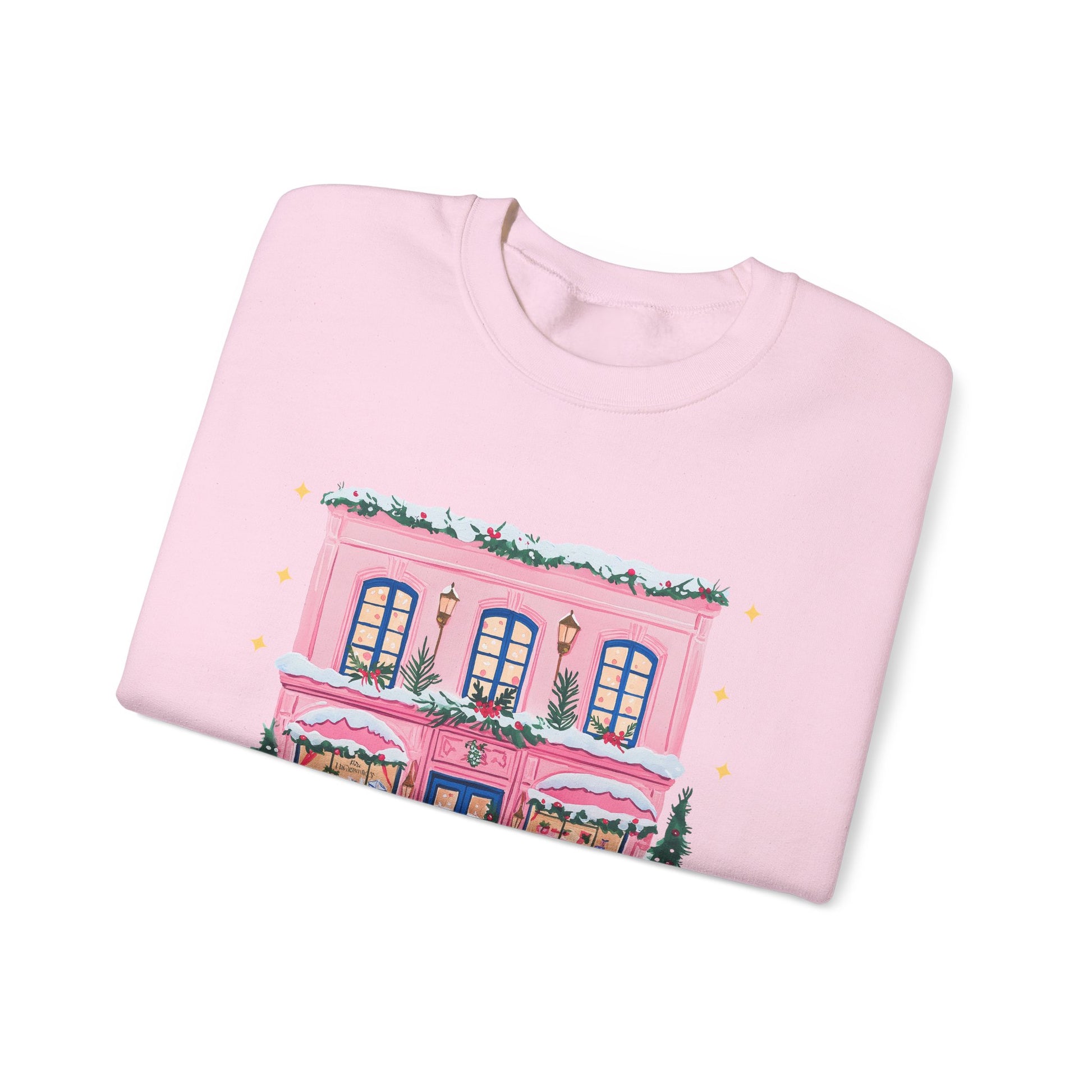 Wrap yourself in a gentle, nostalgic holiday scene with this cozy crewneck. A hand-painted pink storefront, frosted evergreens, and warm windowlight sit at the center — like a postcard from a small-town winter evening. The mid-weight cotton-poly blend feels soft against skin and holds its shape through seasons of wear. Wear it on strolls to holiday markets, quiet afternoons with cocoa, or when you want to carry a little seasonal charm into everyday moments. The embroidered-ready layout and crisp DTG print keep the artwork vivid, while the classic crew cut and reinforced seams make this sweatshirt a comfortable, long-lasting layer in a holiday wardrobe.