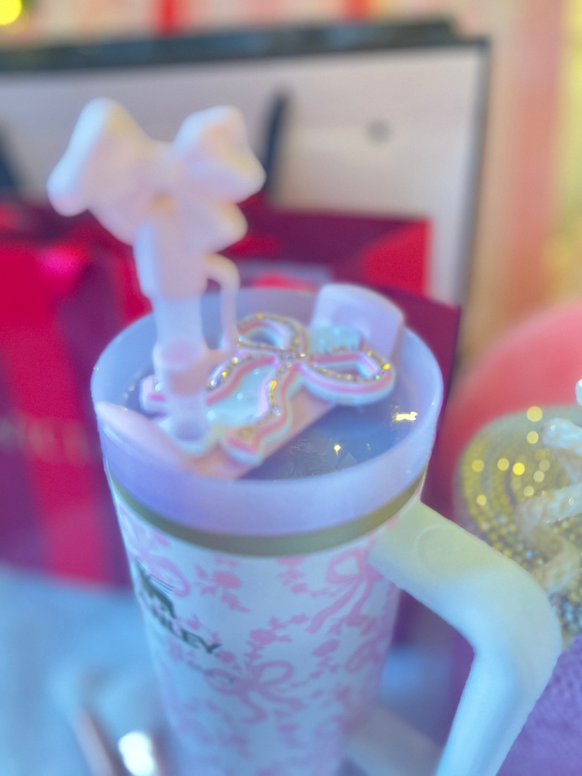 This pink bow straw topper is the cutest little touch for your tumbler. Soft, girly, and finished with a pearl center, she turns any cup into a whole aesthetic.